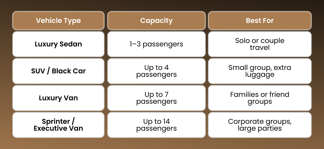 FIFA 2026 car service Boston bookings need to be secured well in advance. The closer you get to match days, the tighter availability becomes across all car services in the region. Booking 4-8 weeks ahead is a reasonable target. If you are traveling in a group, a luxury van or Sprinter covers everyone in one vehicle without splitting up.